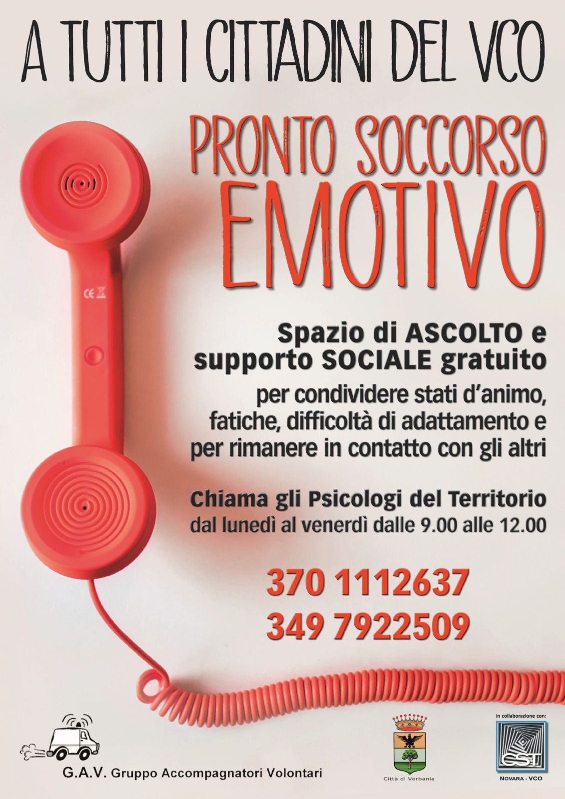 Iniziativa di supporto psicologico rivolto a tutta la cittadinanza della Provincia del VCO e totalmente gratuito. Il servizio è promosso da un gruppo di psicologi del territorio in collaborazione con l’associazione Gruppo Accompagnatori Volontari.